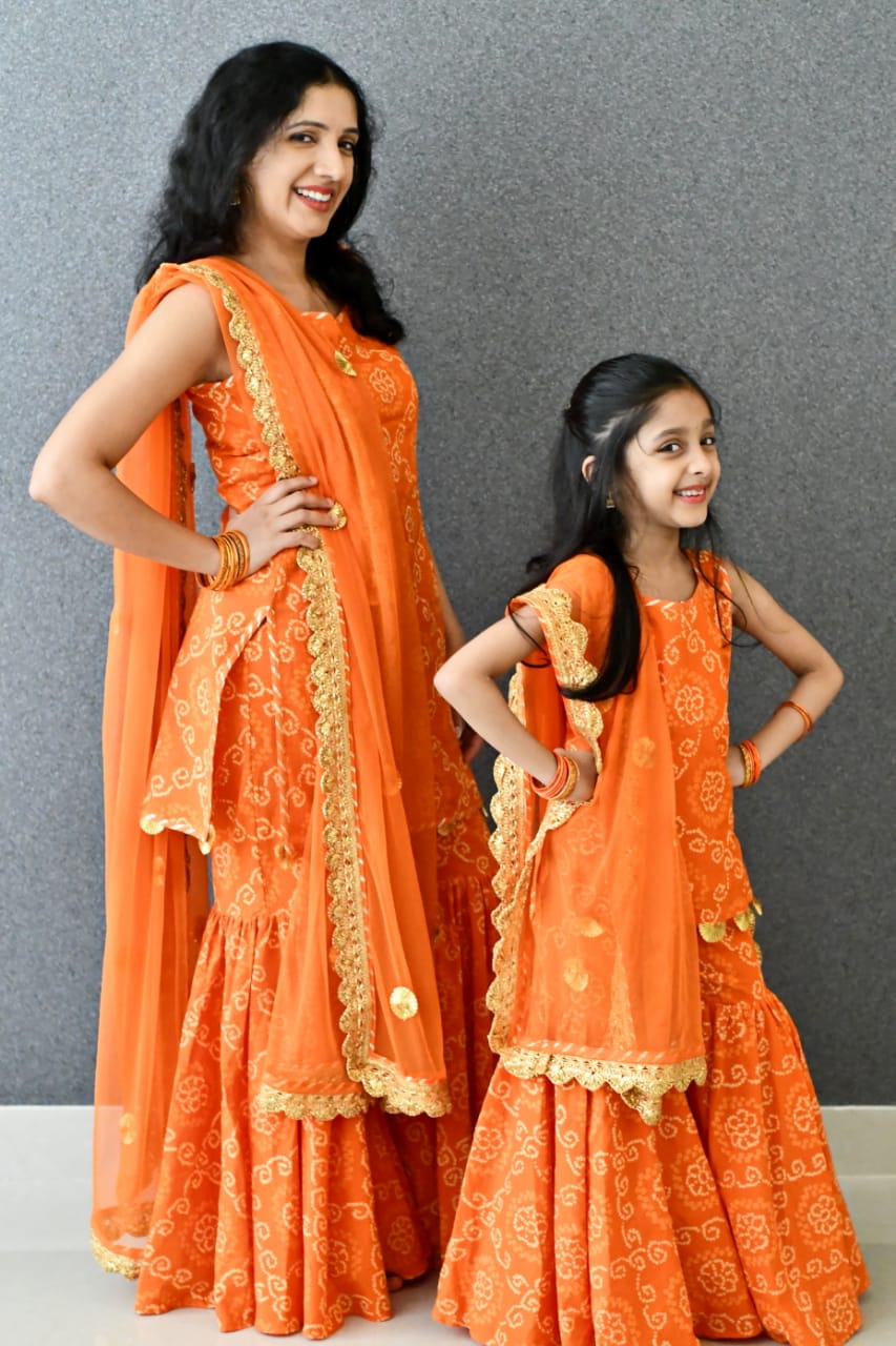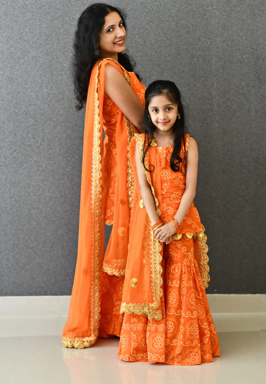 Orange bandhani sharara paired with set soft net dupatta embellished with all over gota work.