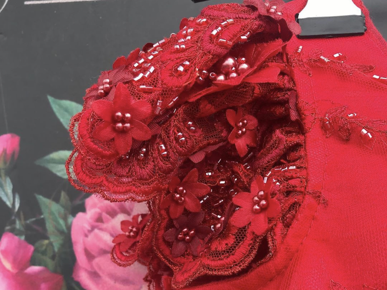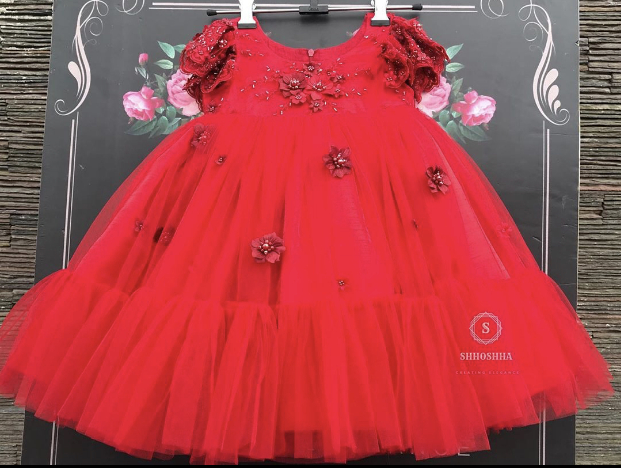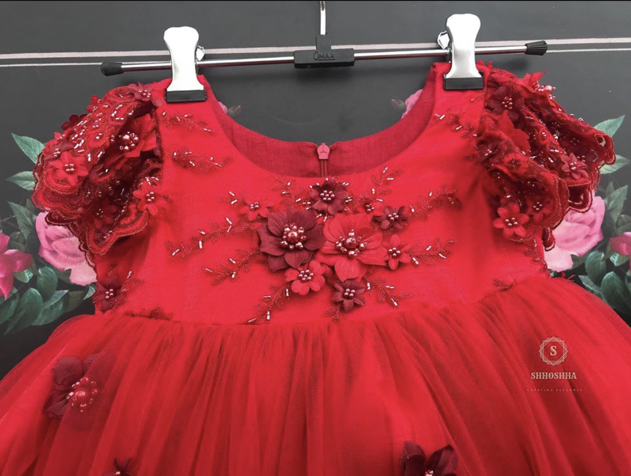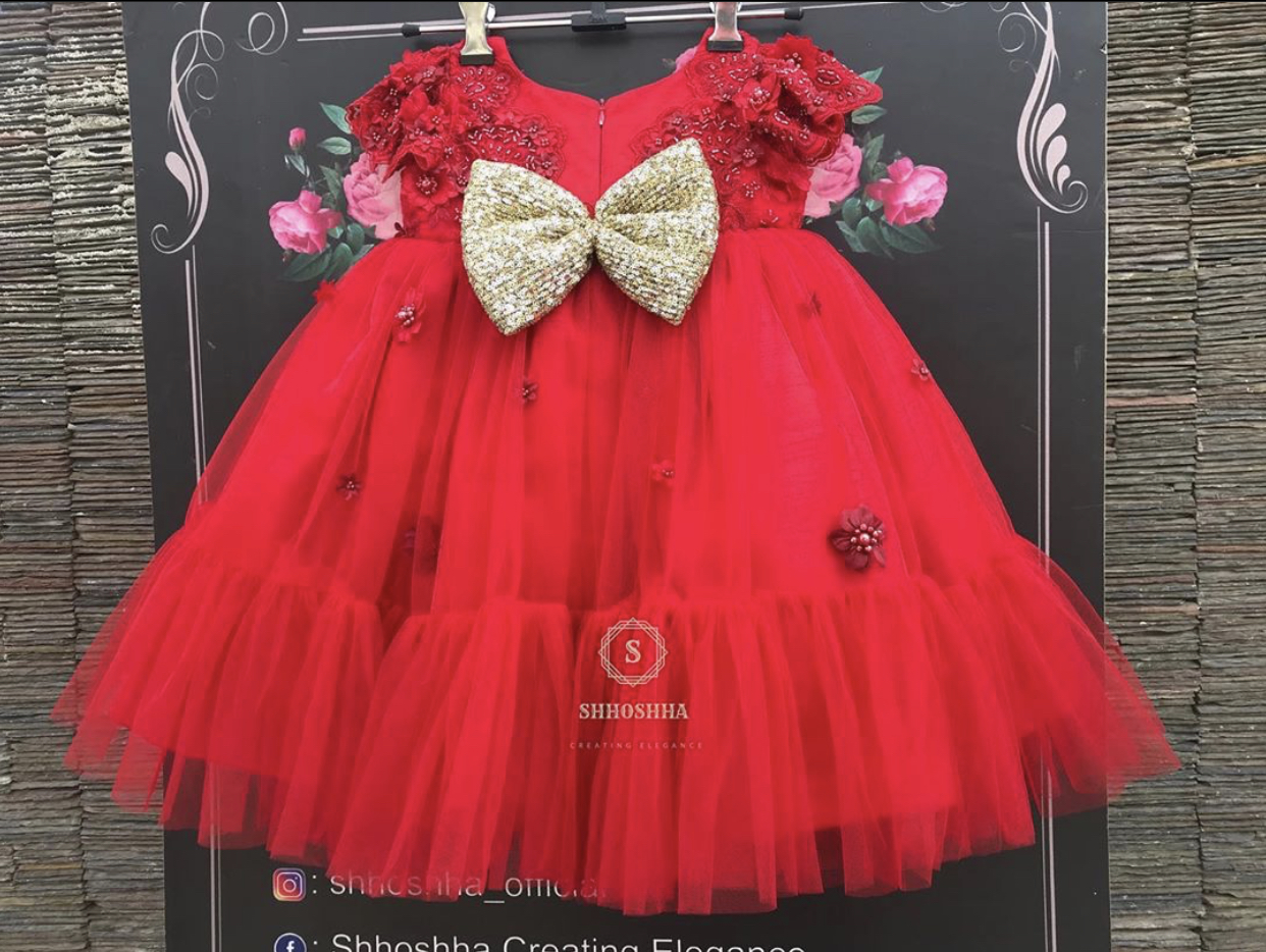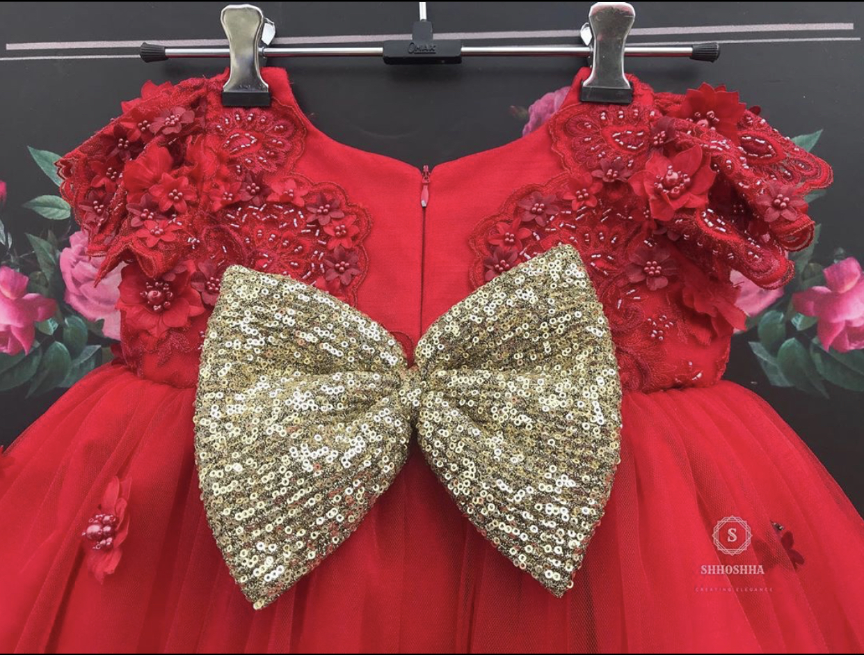cherry red imported net 3D embroidered bodice, soft ruffle cut layering attached skirt.satin & cotton lining & kan kan for extra flounce.Exquisite gold sequin bow at the back of the frock.