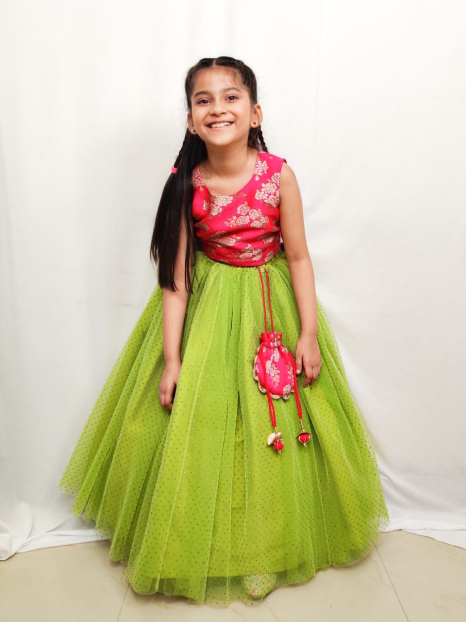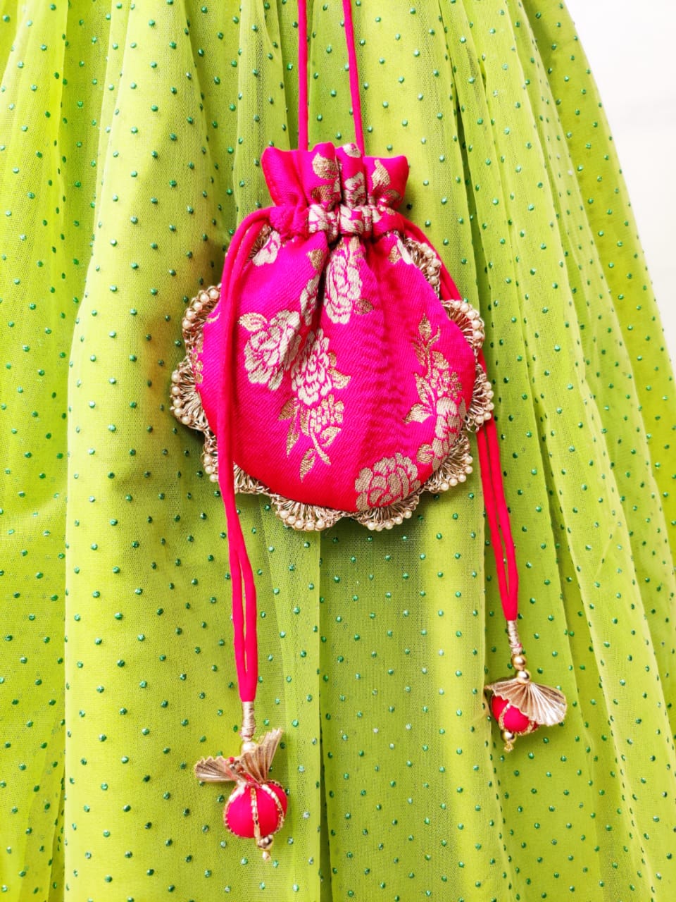 - Green lehenga with Atachable potli