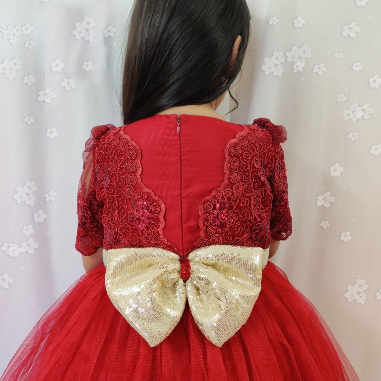 Maroonish red imported net bodice, soft ruffle cut layering attached skirt.satin & cotton lining &  kan kan for extra flounce.Exquisite gold sequin bow at the back of the frock.