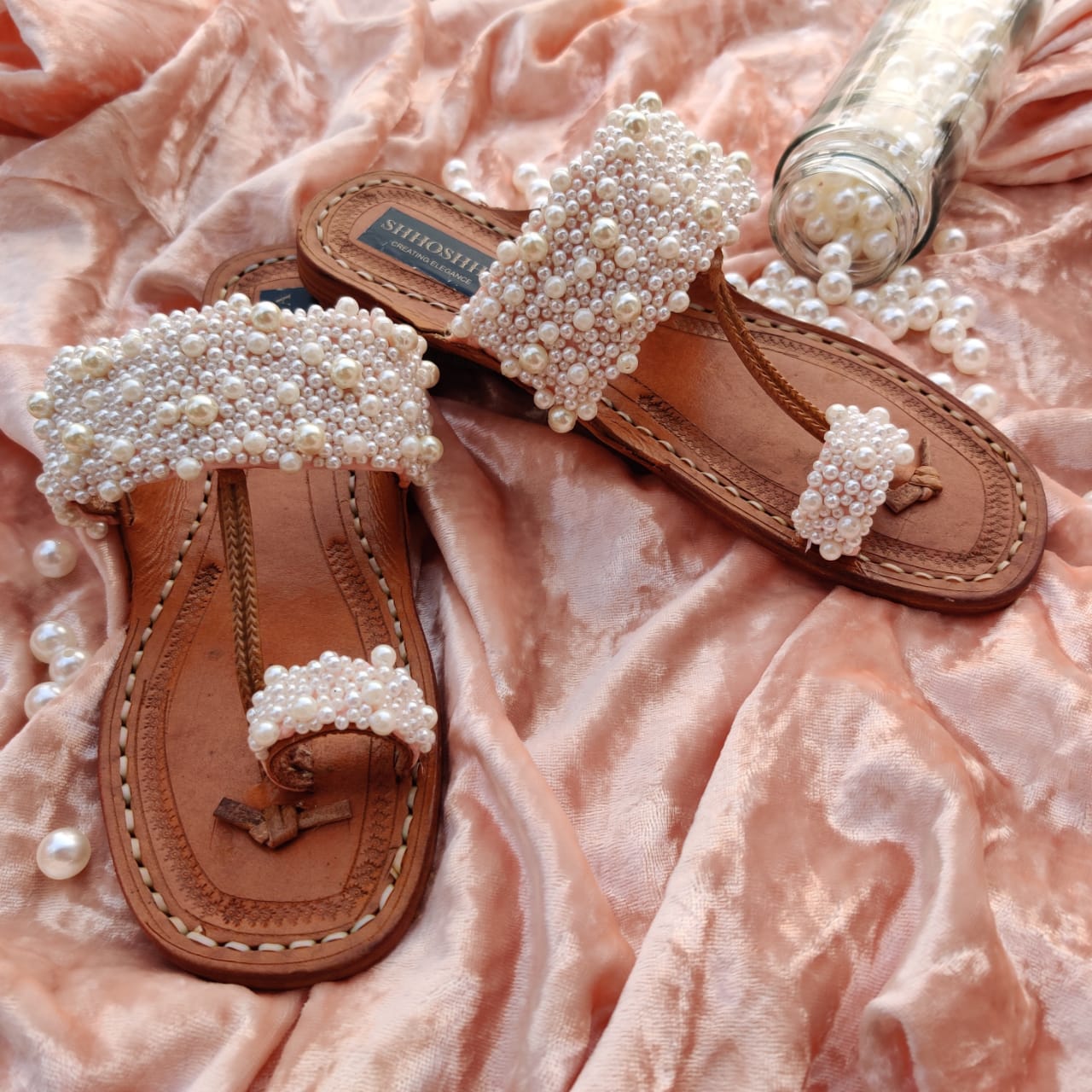 Intricate hand embroidery of white pearls covering the whole of footwear. It’s elegant and so pretty!