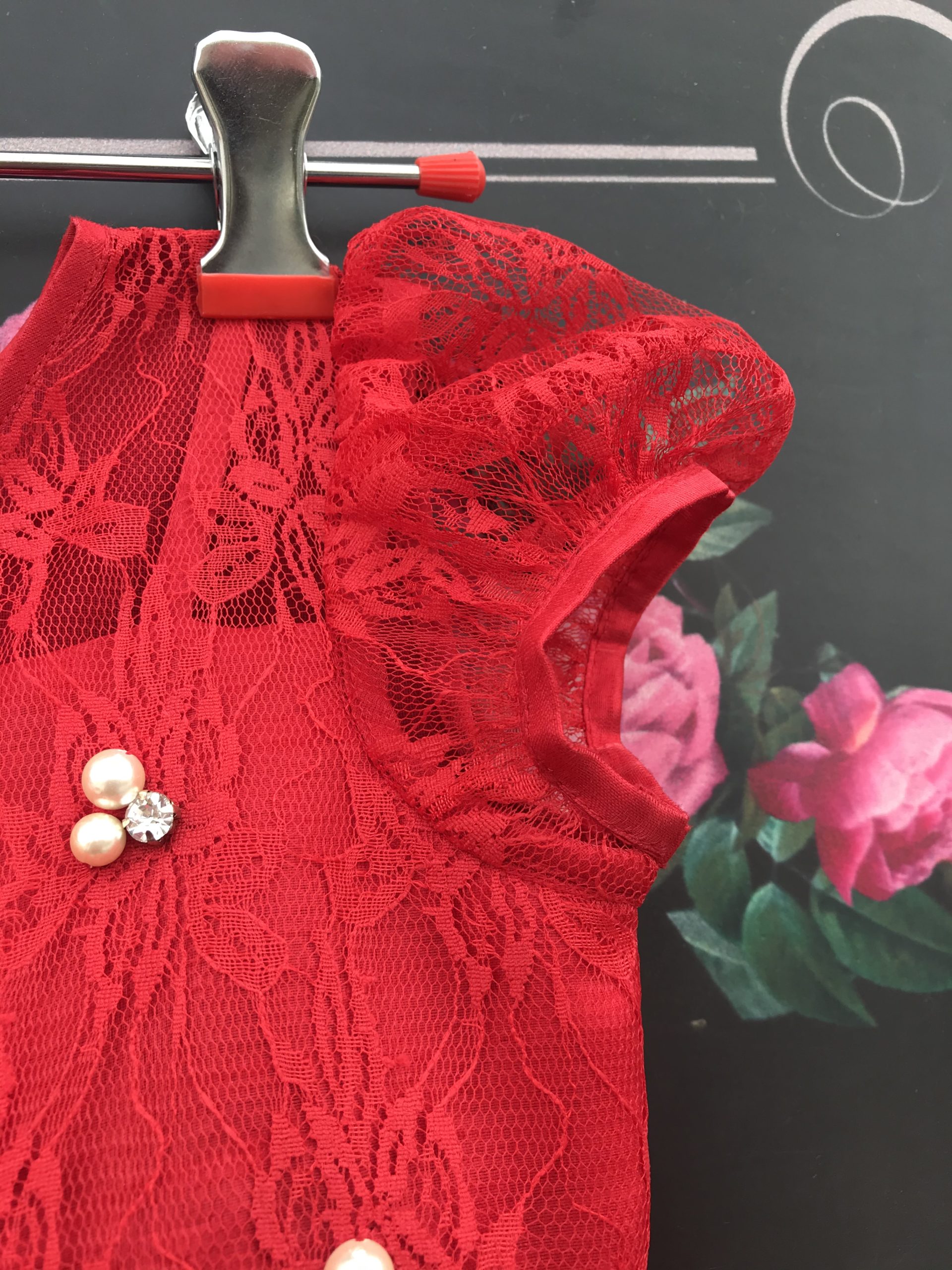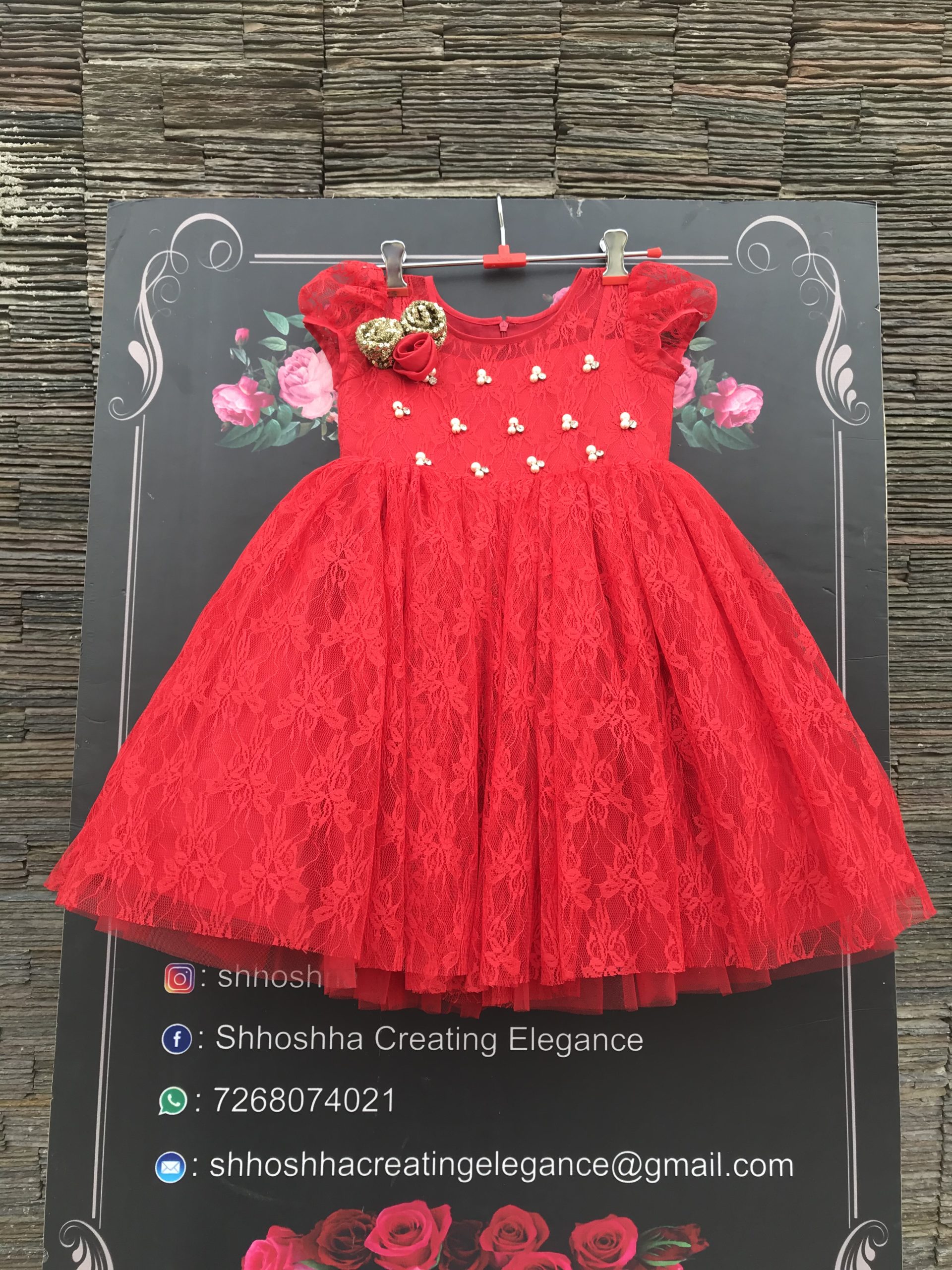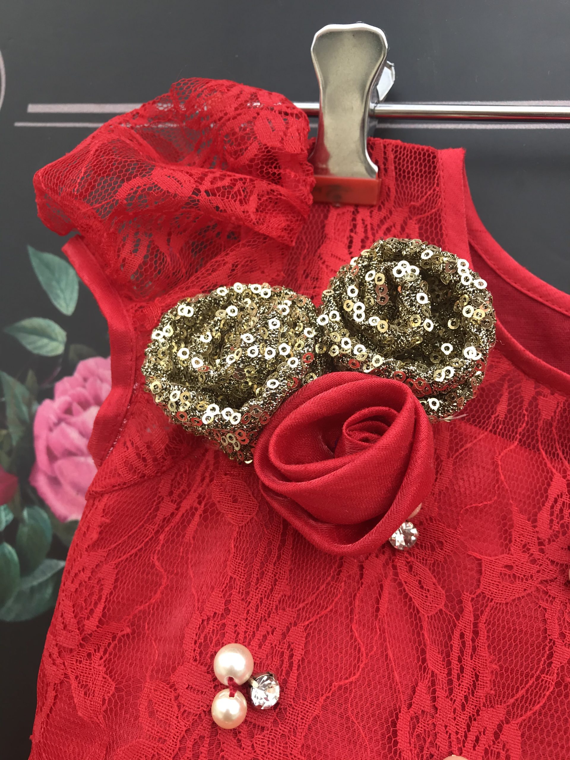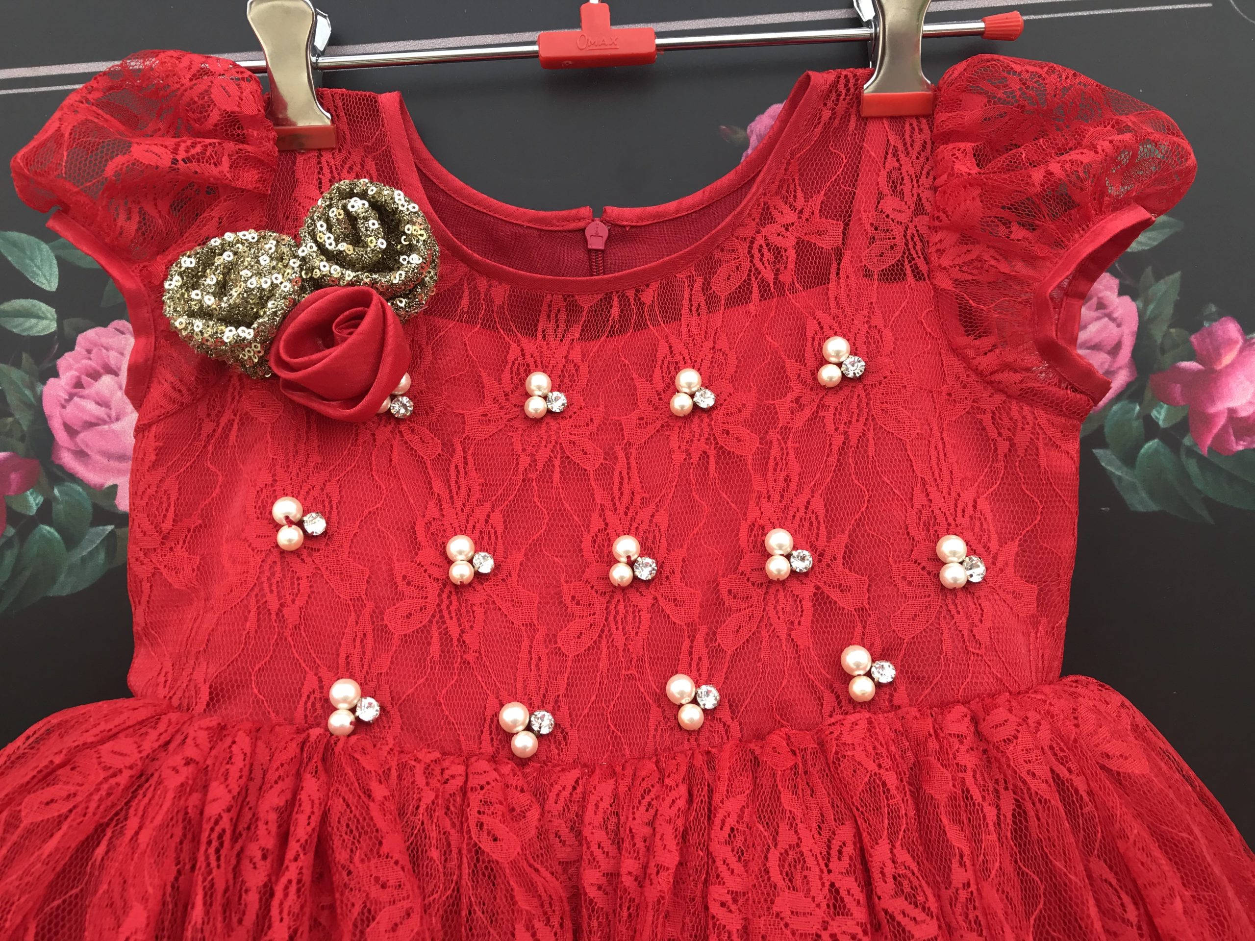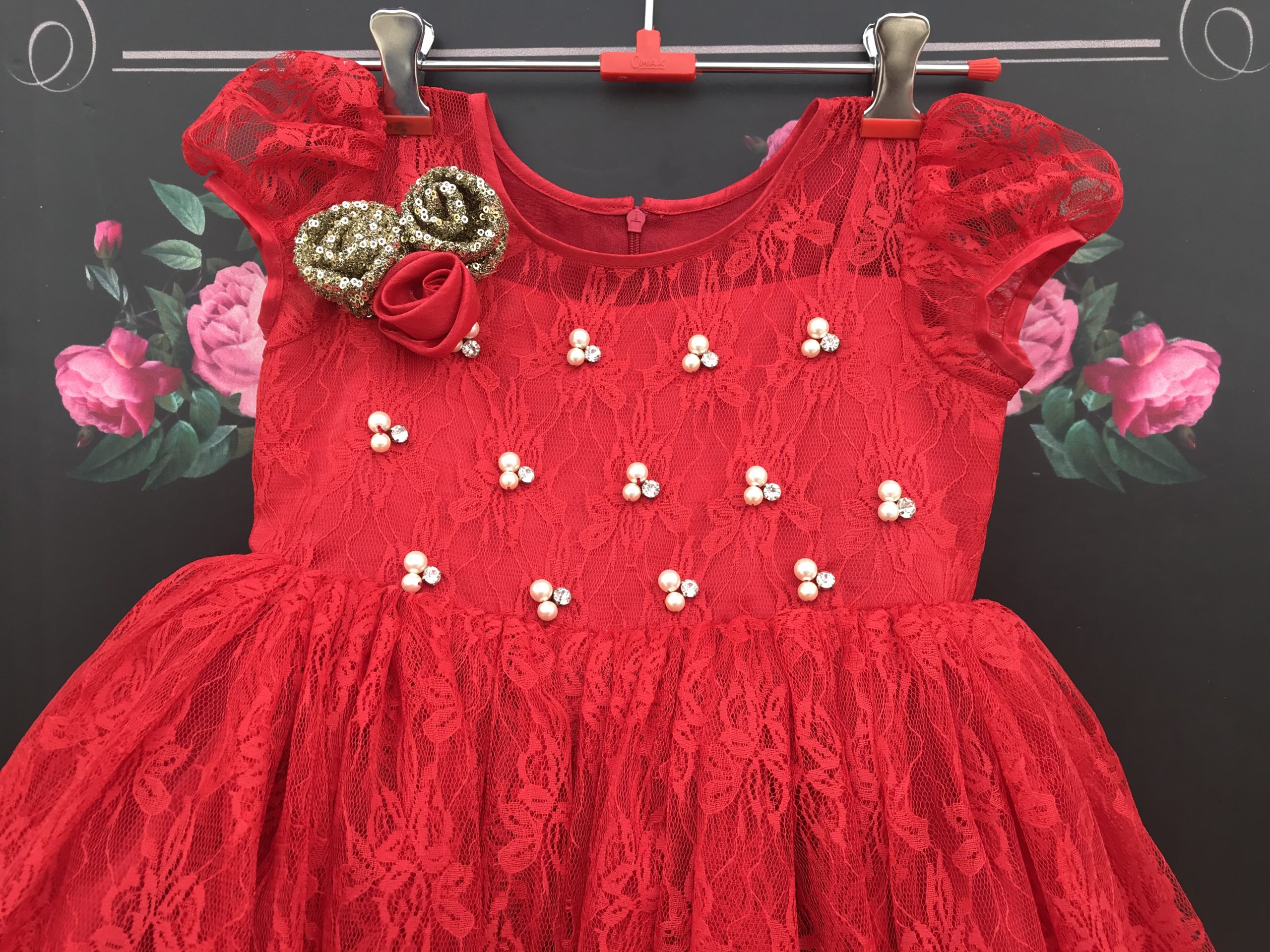 Candy red raschel net bodice embroidered pearls and diamond , raschel layering attached skirt.satin & cotton lining & kan kan for extra flounce.Exquisite gold sequin flower at the front bodice of the frock.