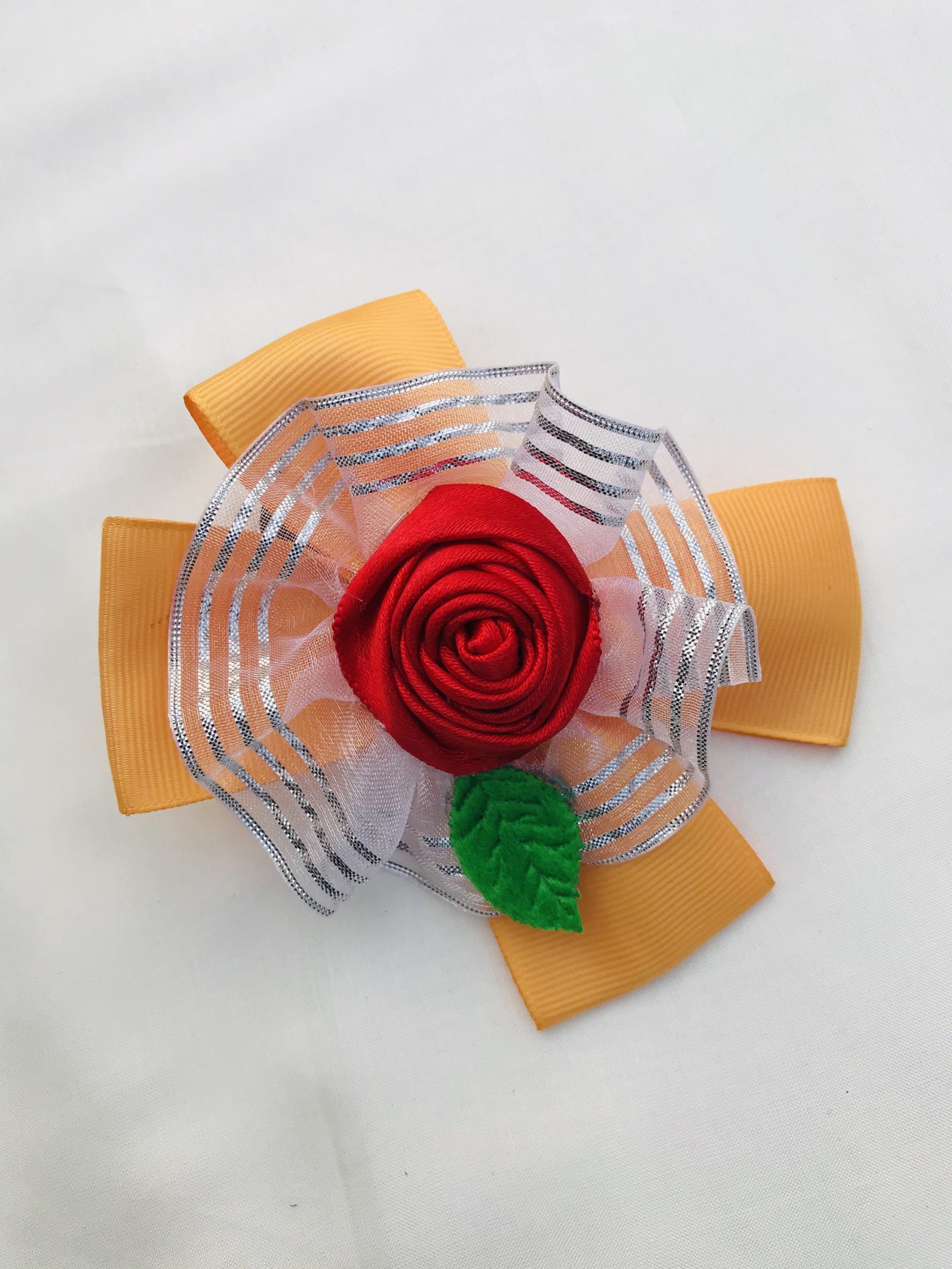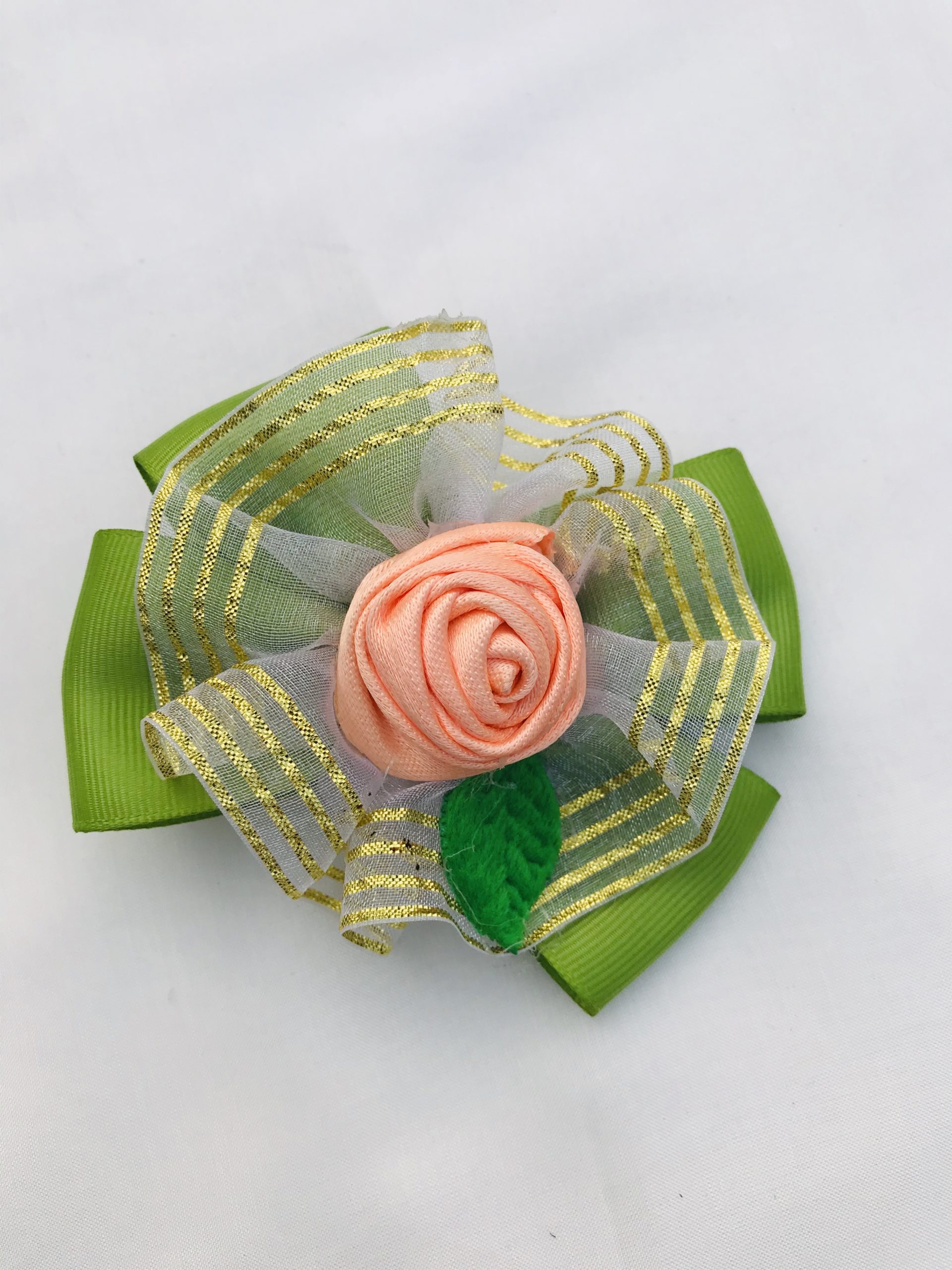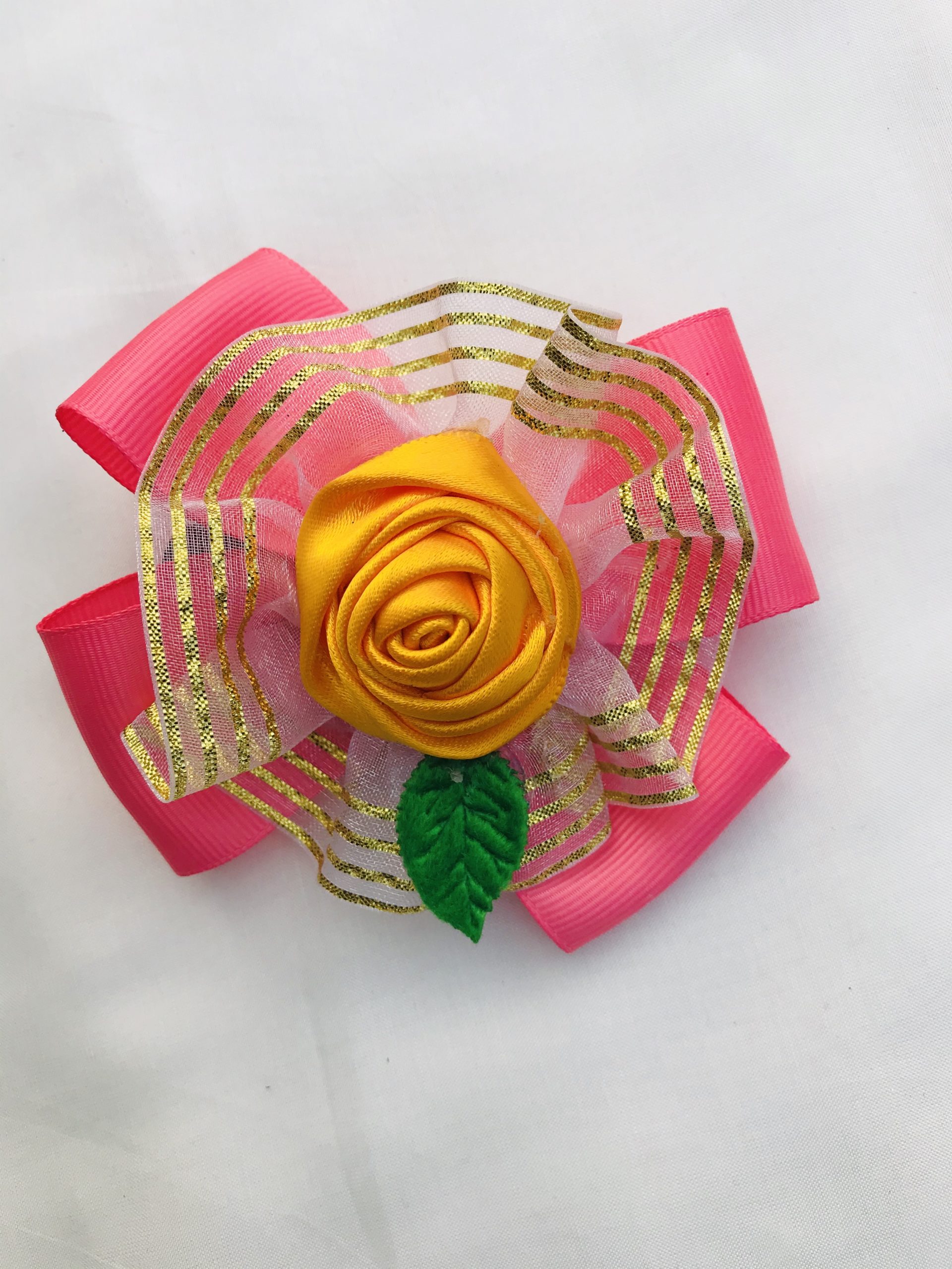 This Product Features Grosgrain Ribbon, Rose made of Ribbon, Net, Fabric Leaf and a metallic clip.