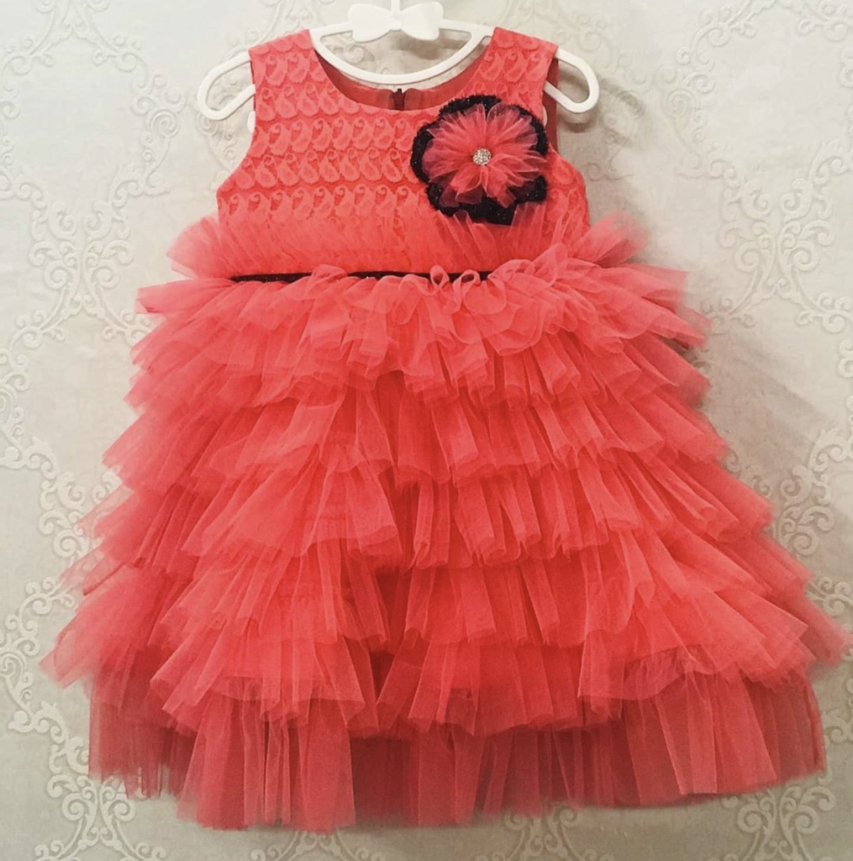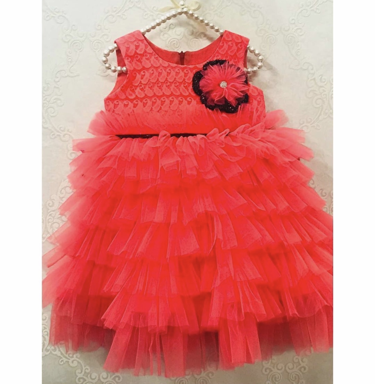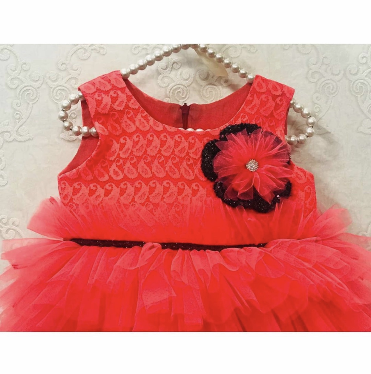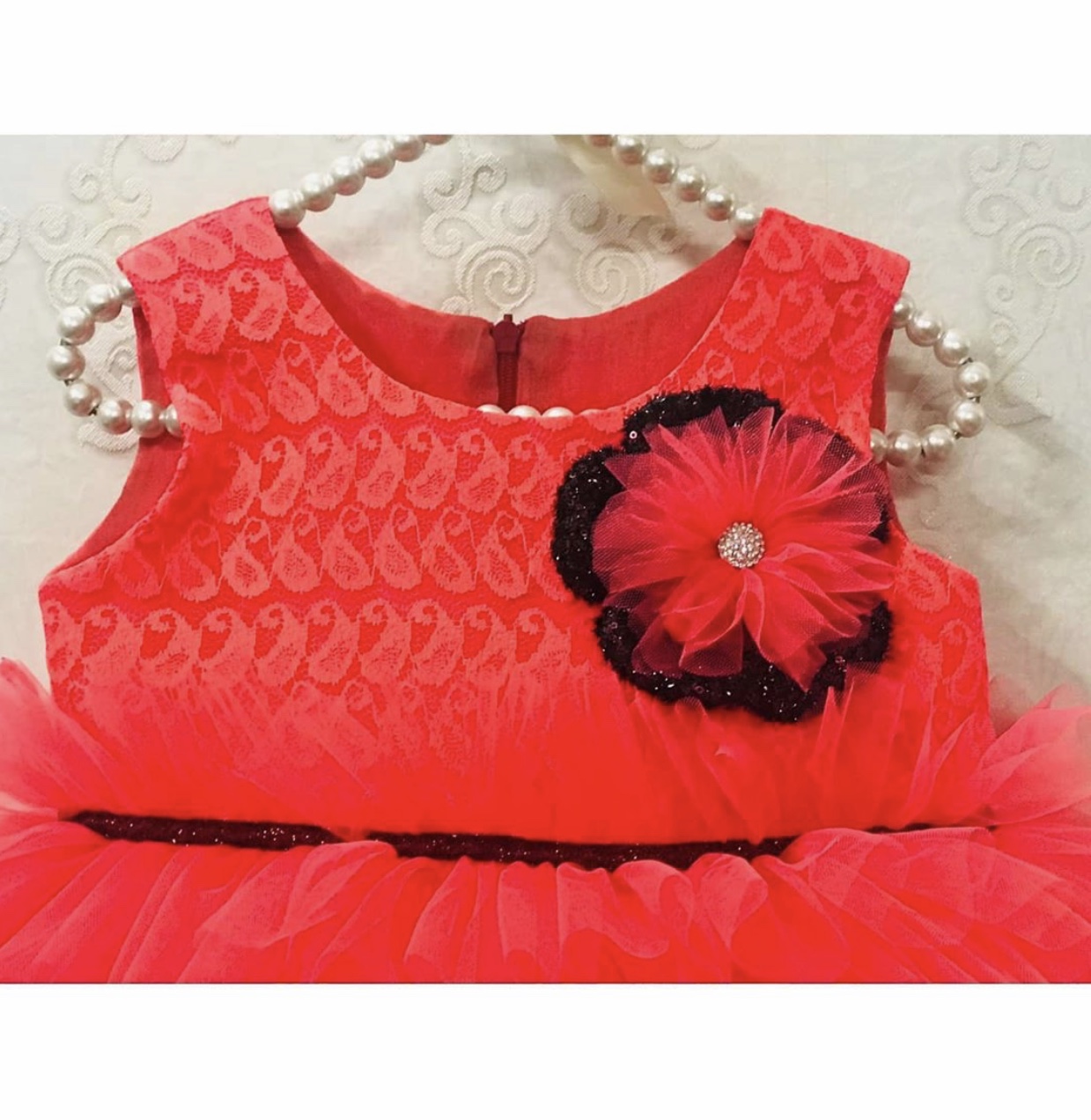 Salmon Imperial red raschel net bodice, ruffle cut layering attached skirt.satin & cotton lining &  kan kan for extra flounce.Exquisite wine sequin flower at the bodice of the frock.