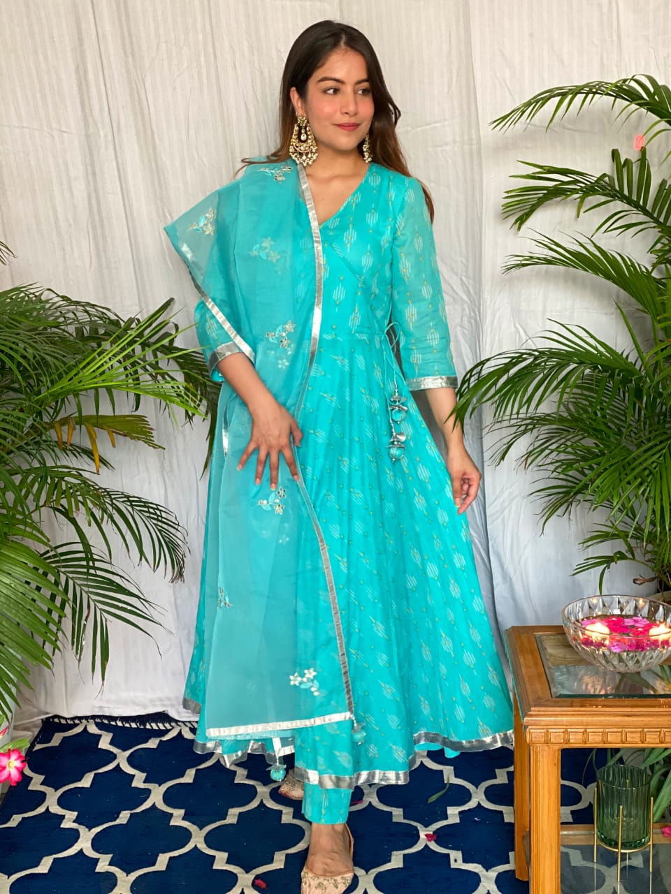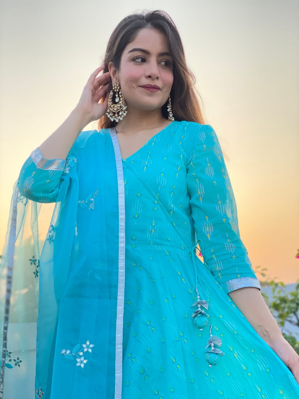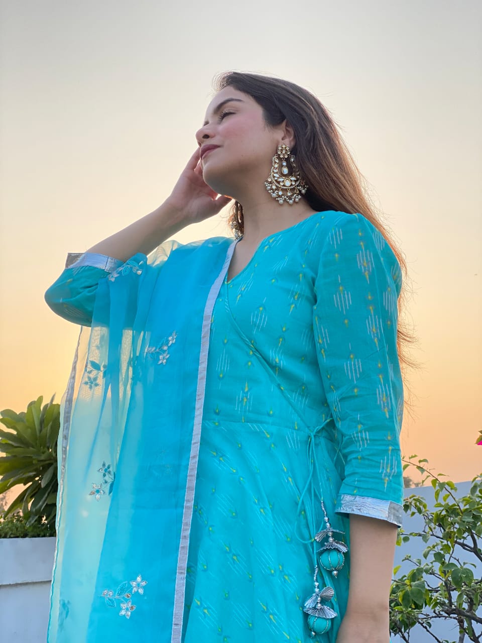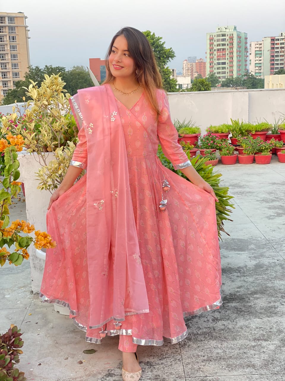 Mulmul Umbrella angrakha anarkali suit set featuring gota details on the sleeves incorporated with handcrafted tassels on the hemline. The anarkali is enhanced with fine gota laces. The Kurta is paired with Mulmul Cigarette Pant & Chevron organza dupatta featuring Gota work Boties & handcreafted tassels on the each corner of dupatta.