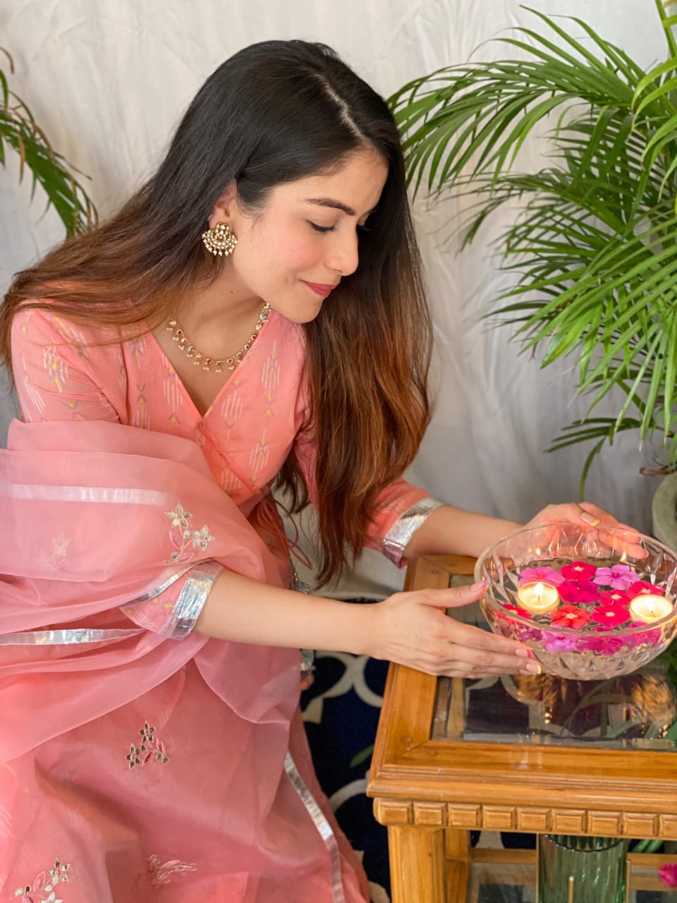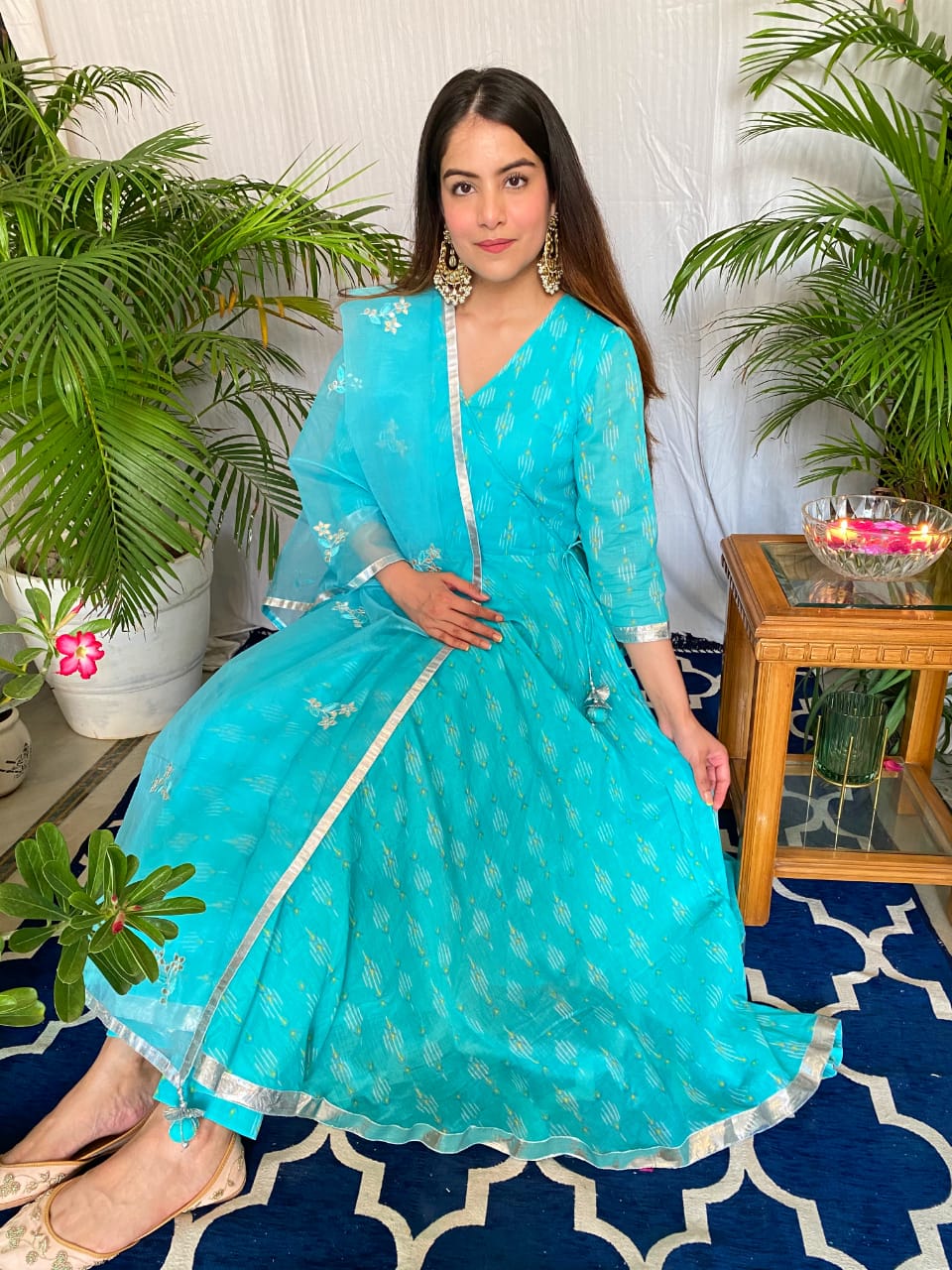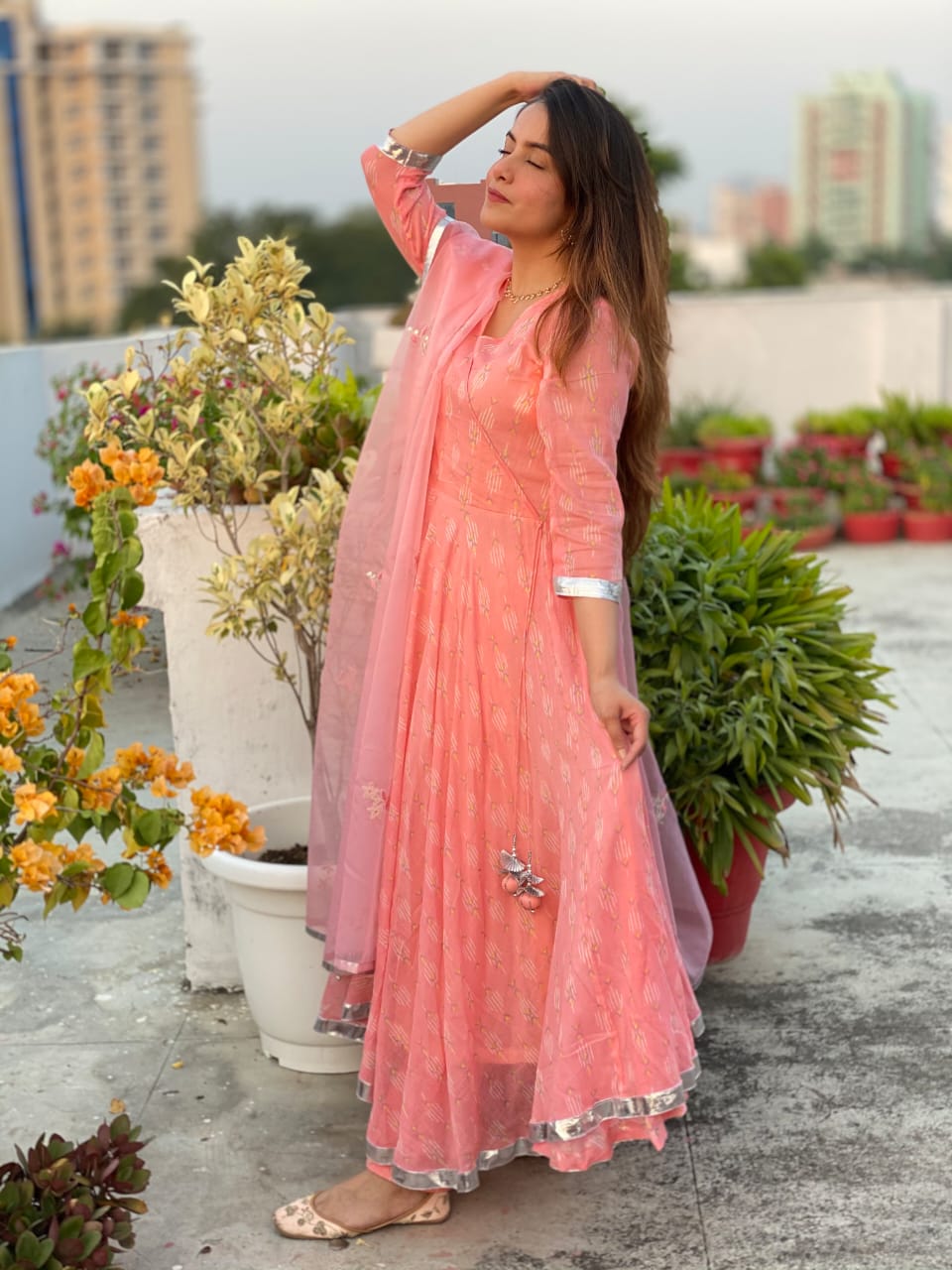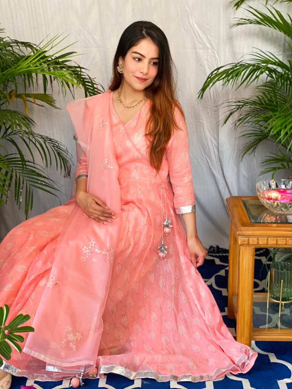 Mulmul Umbrella angrakha anarkali suit set featuring gota details on the sleeves incorporated with handcrafted tassels on the hemline. The anarkali is enhanced with fine gota laces. The Kurta is paired with Mulmul Cigarette Pant & Chevron organza dupatta featuring Gota work Boties & handcreafted tassels on the each corner of dupatta.