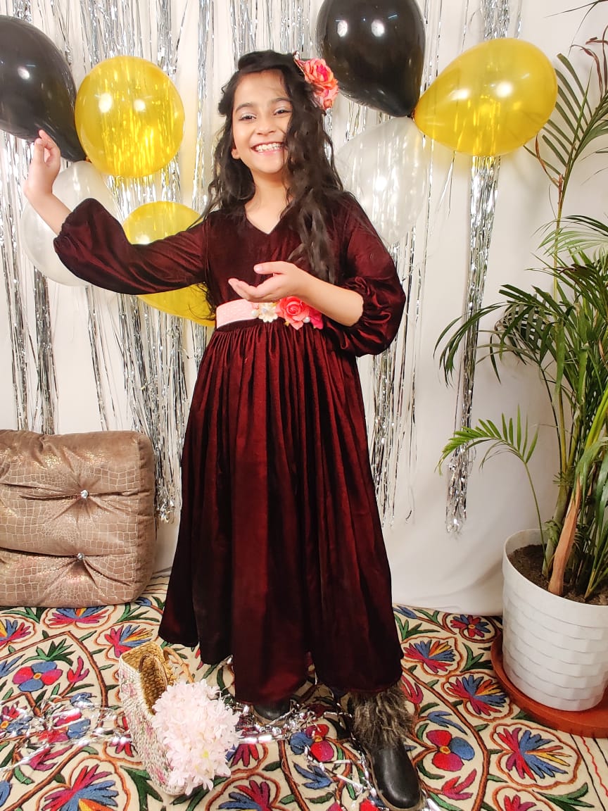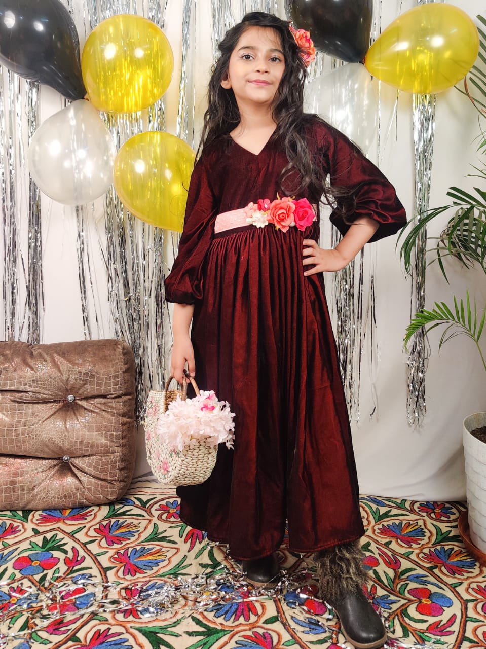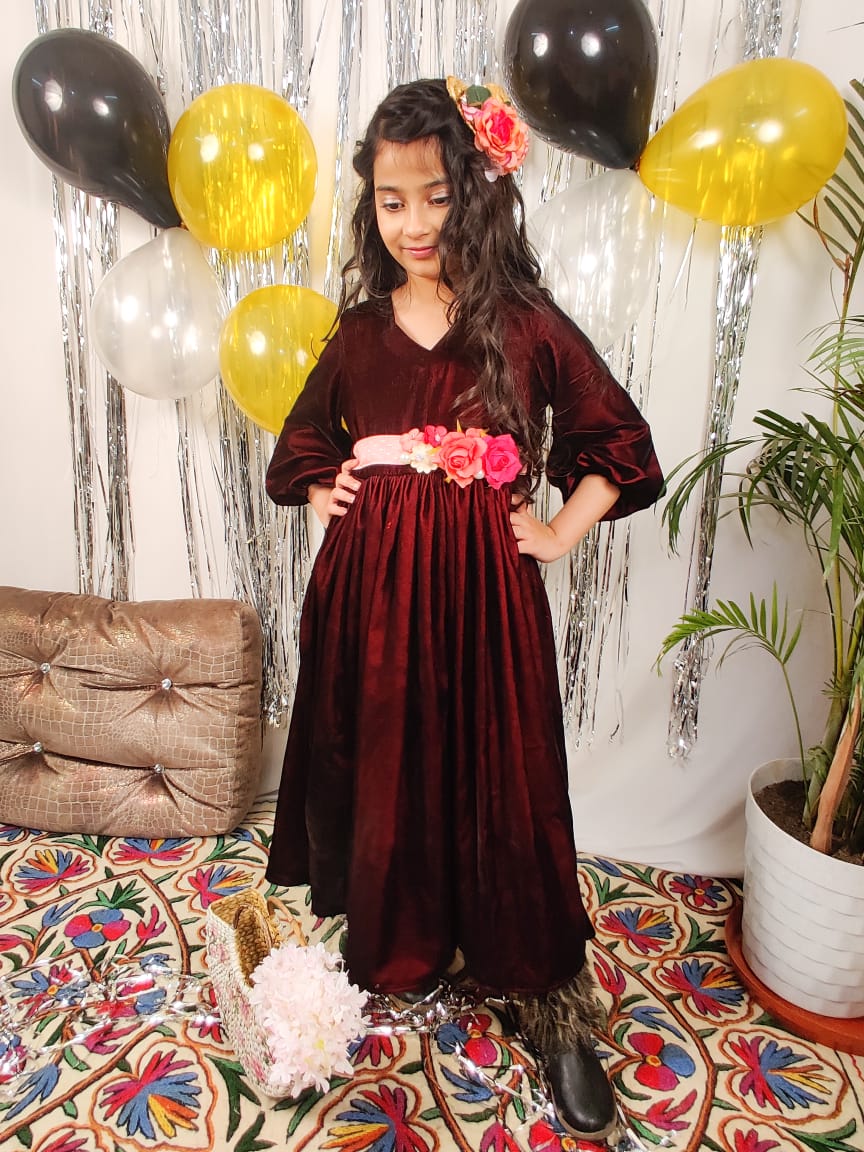 + Free ShippingThis maroon elegance, made in velvet, is a dream come true for your little pony. She can twirl and swirl to her hearts fullest. Bishop Sleeves, Floral lace in the front, make it fancy and cute. Its effortless and comfortable style will make your little doll look majestic.