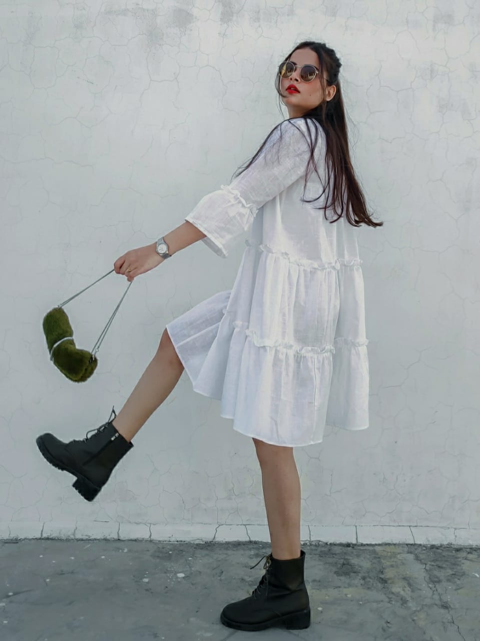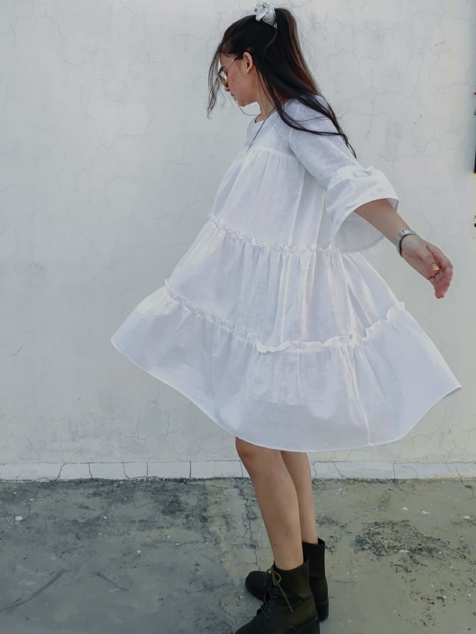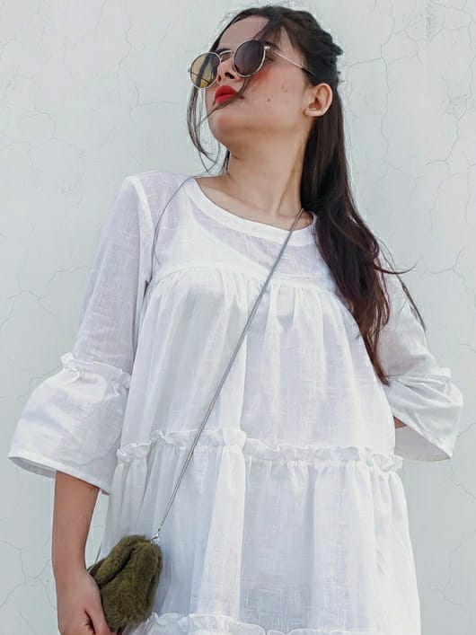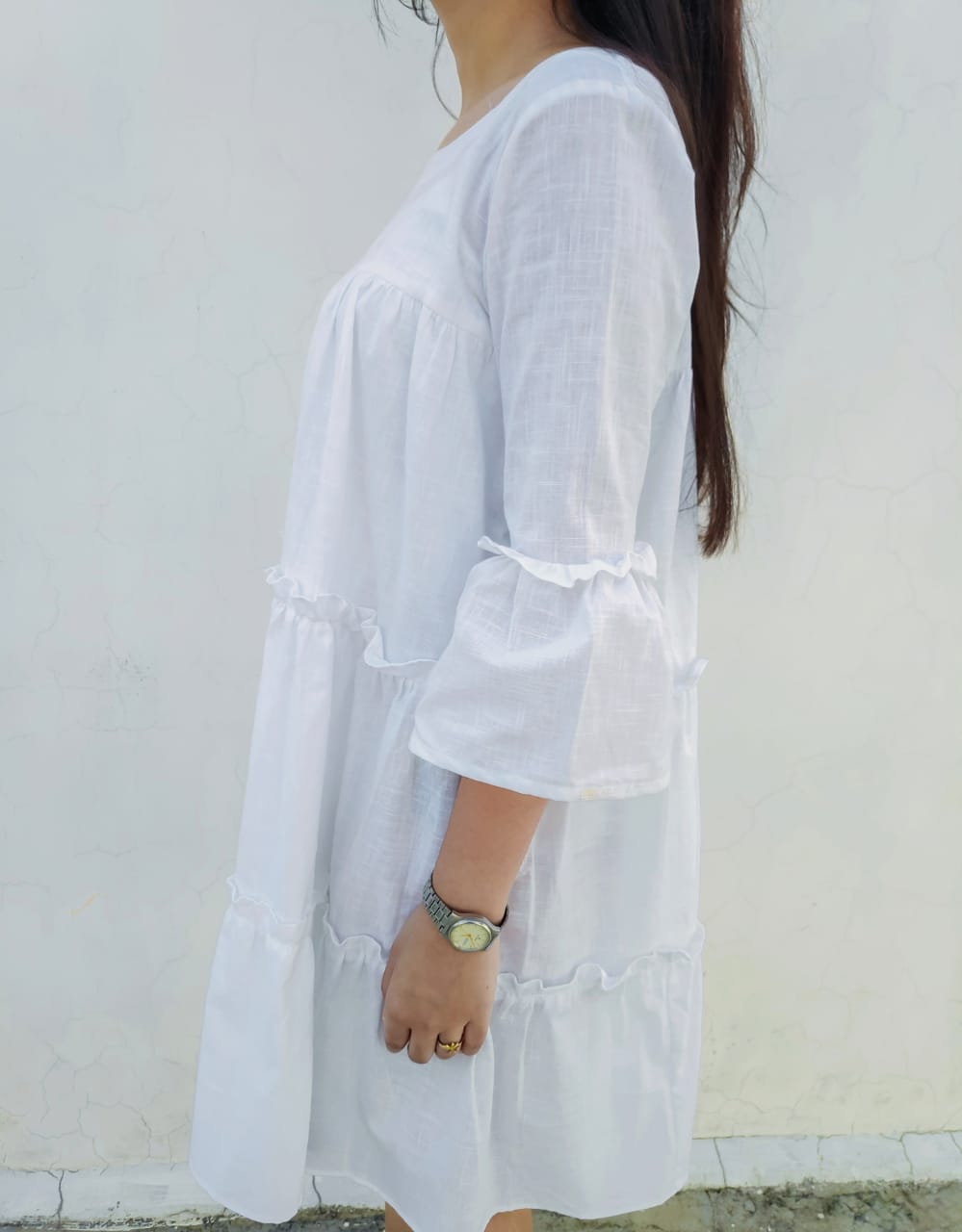 Short A-line dress in cotton weave with gathered tier on the skirt.Round front neckline & 3/4 bell sleeves .