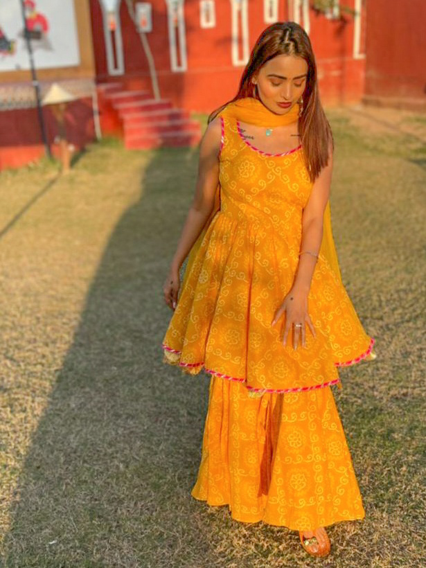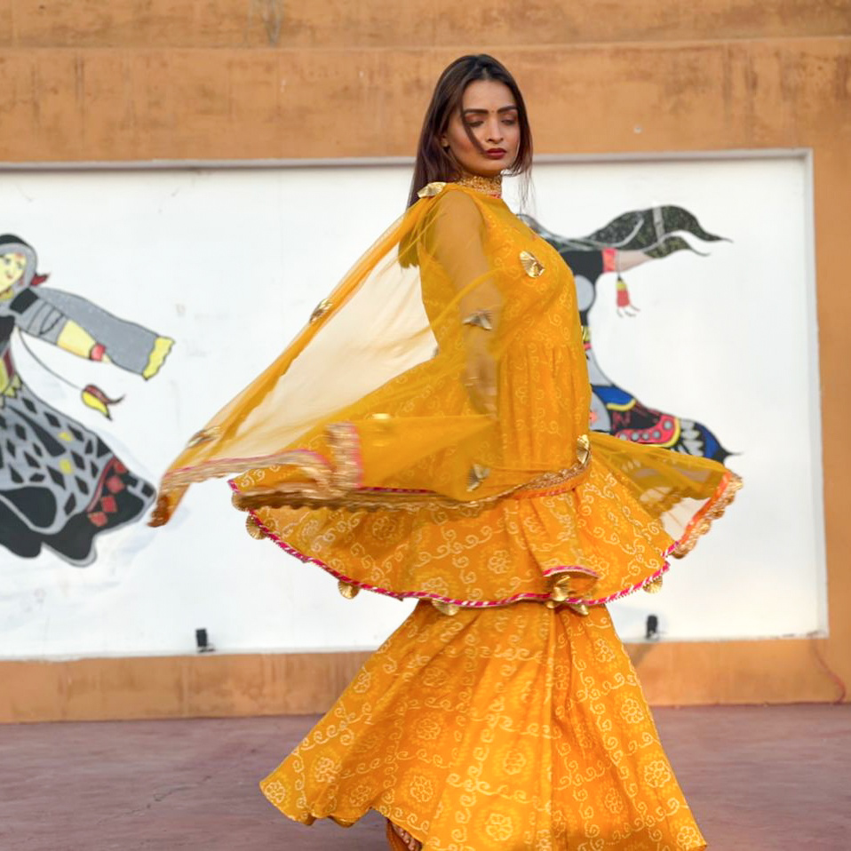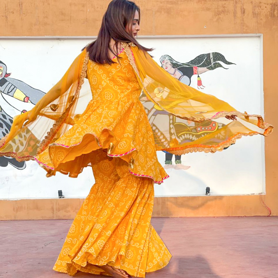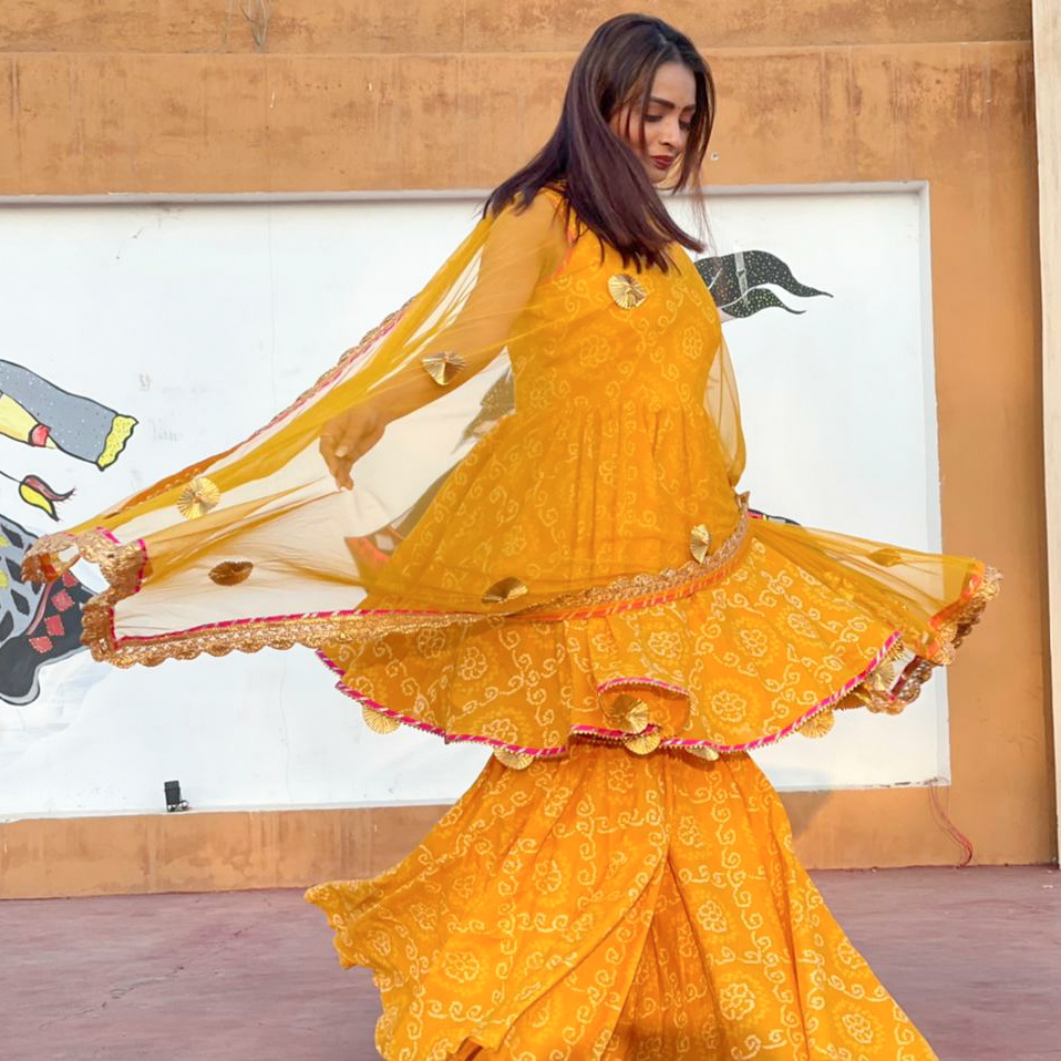 Yellow bandhani sharara paired with set soft net dupatta embellished with all over gota work.