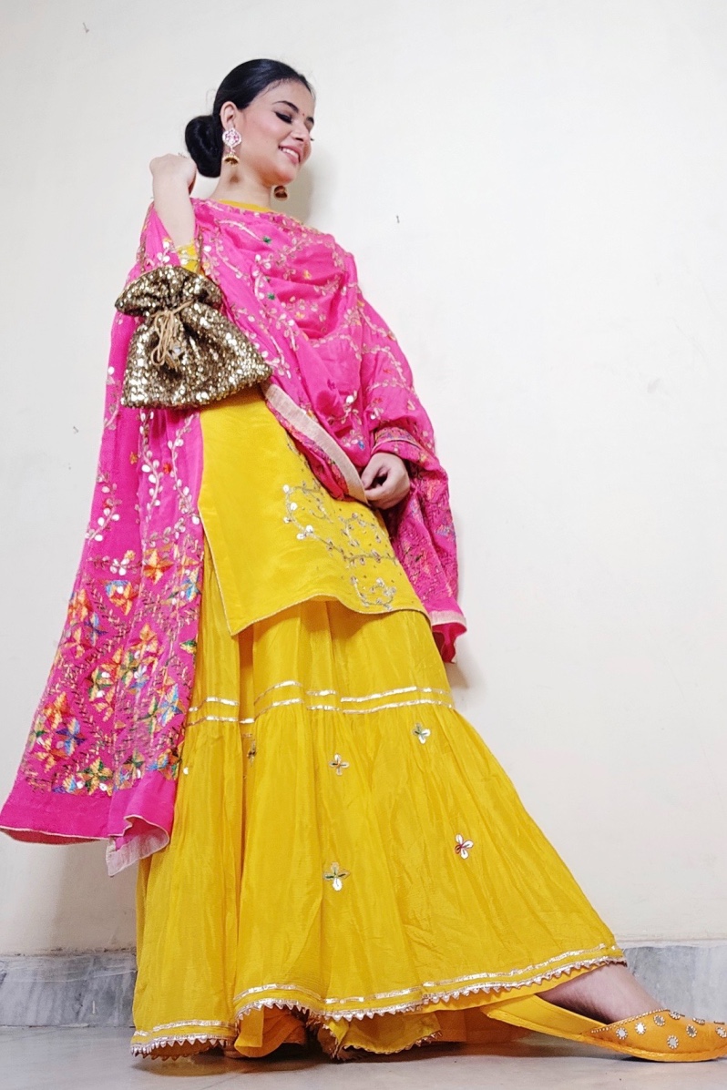 yellow chenon phulkari gota sharara suit set paired with pure chenon phulkari dupatta embellished with all over gota work.