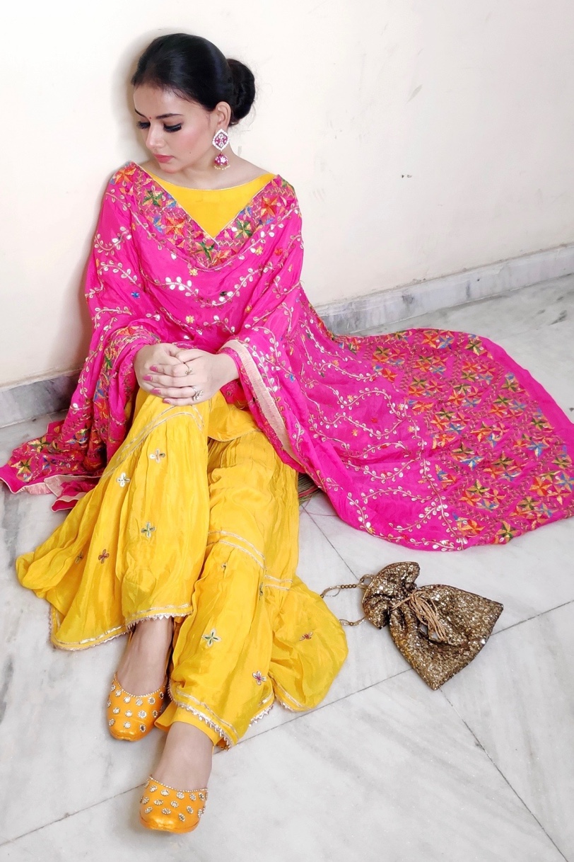 Yellow Phulkari Sharara Suit